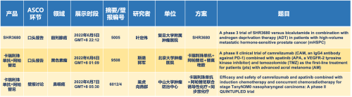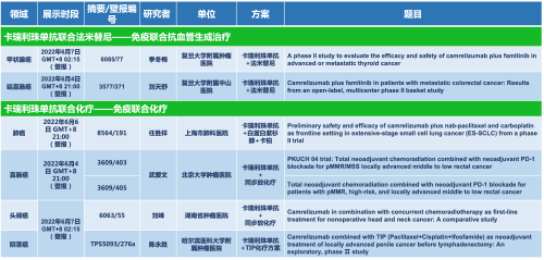 卡瑞利珠单抗联合利来国际医药的另一款创新药法米替尼在甲状腺癌和结直肠癌领域有2项研究被接收为壁报,另有卡瑞利珠单抗联合化疗的4项研究在肺癌、结直肠癌、头颈癌和阴茎癌领域的研究被接收为5份壁报。